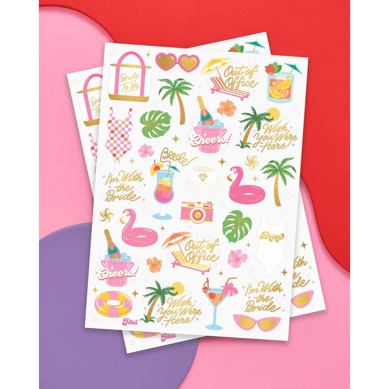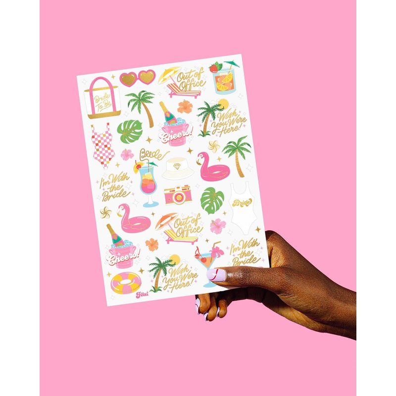 Our summer pool party foil tattoos are the perfect addition to your bachelorette party! There are 50 total designs to choose from, all proven to be waterproof, durable and skin safe. Inspired by your summer pool party, we created exclusive designs of palm trees, martinis, swimsuits, cocktails, cameras, totes + more that makes for the cutest party favors. With a simple application process, everyone at the party will love these. Want more? We make a whole bunch more party supplies just as cute as these in our storefront!