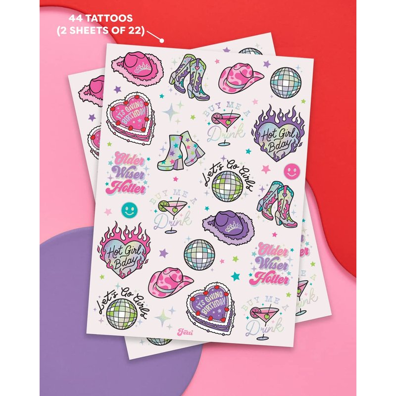 xo, Fetti Birthday Party Decorations Temporary Tattoos - 44 pcs | Fun Bday Girl Party, Older, Wiser, Hotter, HBD, Disco Cowgirl Party, Hot Girl Bday