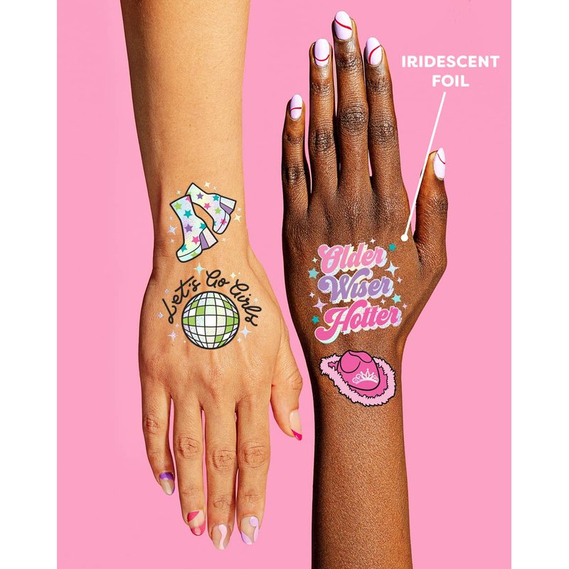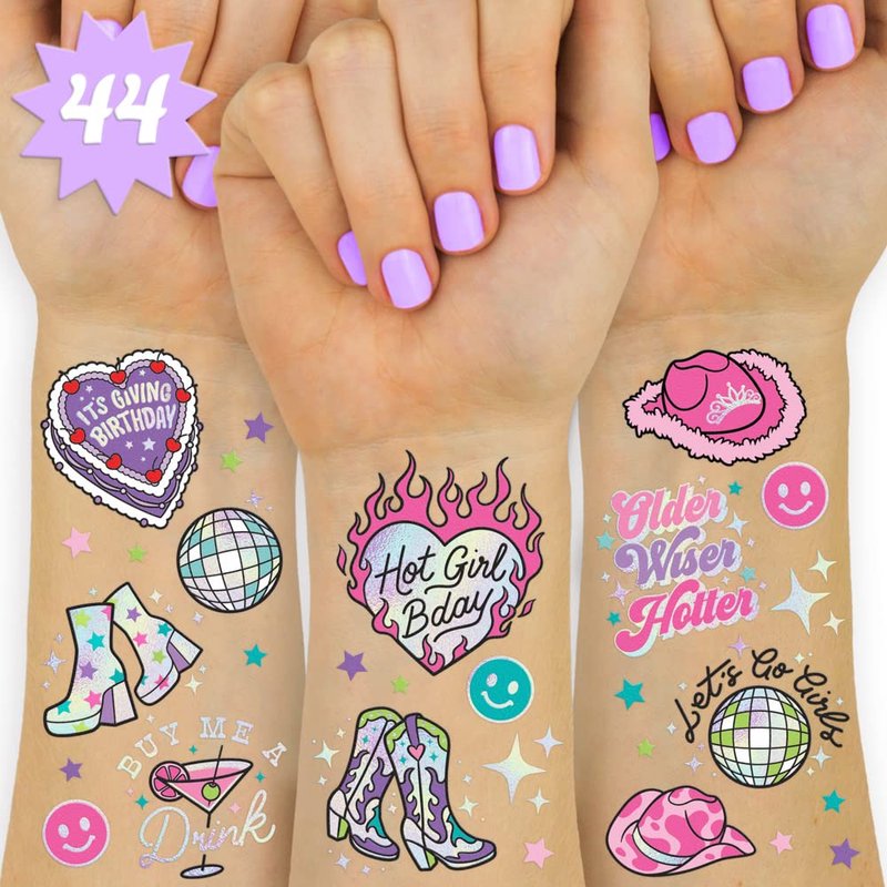 It's giving Birthday! Get ready to strut your stuff on your big night with this set of 44 metallic temp tats! We won't judge if you and the squad end up pulling an all-nighter - this set of tattoos is designed with long nights in mind + promise to stick around for a full 24 hours! Whenever you ARE ready to kiss them goodbye though, simply use baby oil, micellar water, or makeup remover! We hope your phones are charged - good luck resisting an absolute photoshoot at the club with our extra, extra sassy Birthday girl tats. Give yourself a round of applause for finding these bad boys :) These temporary tattoos truly are the ultimate birthday party decoration!