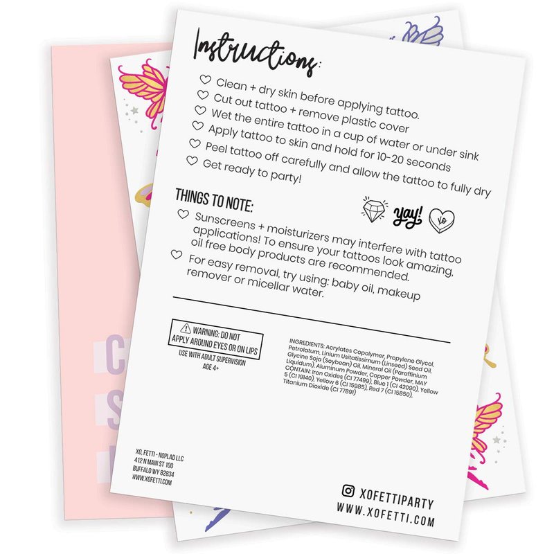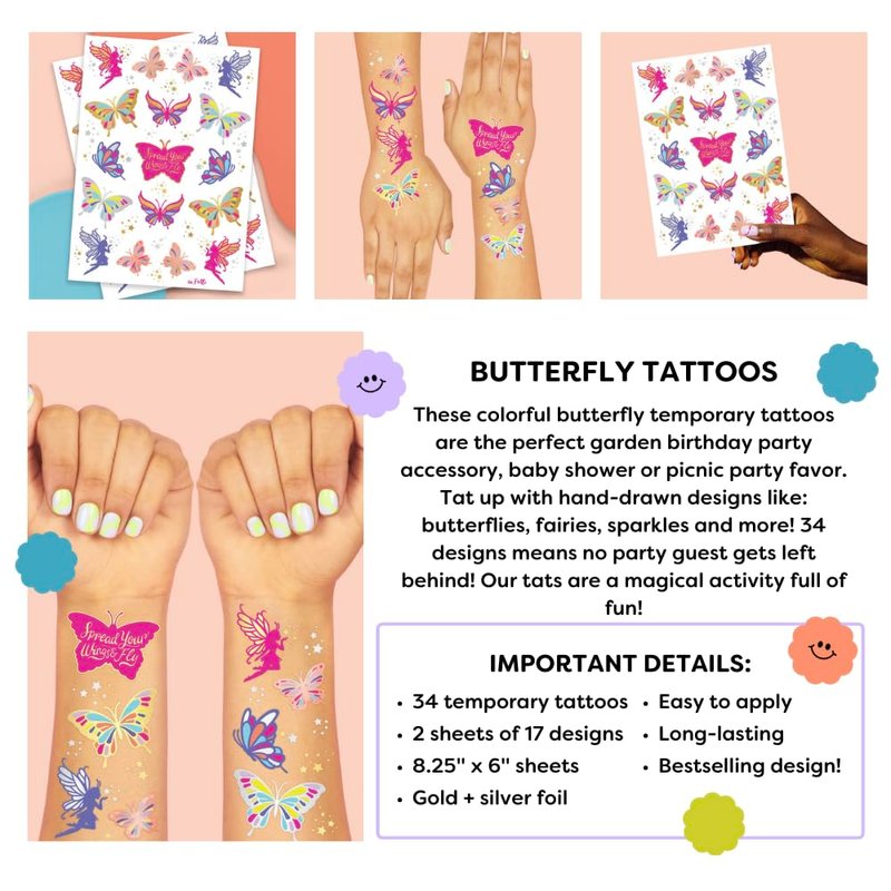 A few notes about our butterfly tattoos: - 2 sheets + 34 tattoos means there's one for everyone - nobody gets left behind :) - Party tested + approved... our tattoos will last day into night!- Unique designs featuring butterflies, fairies + stars :) - Can be used for birthday parties, bridal showers + halloween!