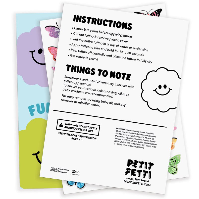 For all the Butterfly Beings! Flutter your way into the most magical party with this extra bright + colorful set of temporary tattoos! 2 sheets totaling 46 tats means there's one for every busy bee at the party - no butterfly gets left behind! :) Elevate your party with these tattoos that feature all sorts of garden guests: butterflies, hearts, and pretty flowers! Sounds like a fair-y good time!! Party tested + approved... our tattoos will last day into night - so put on your wings and get to it!