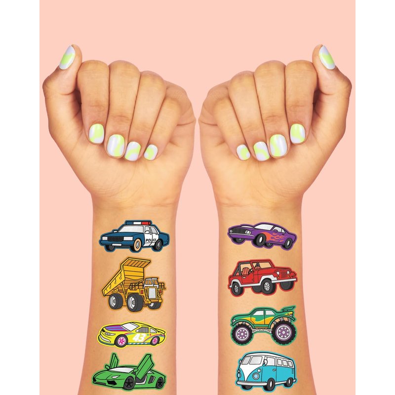 - Tat up: with foil designs like race cars, monster trucks, muscle cars + more. Guaranteed to be a favorite by all party guests!