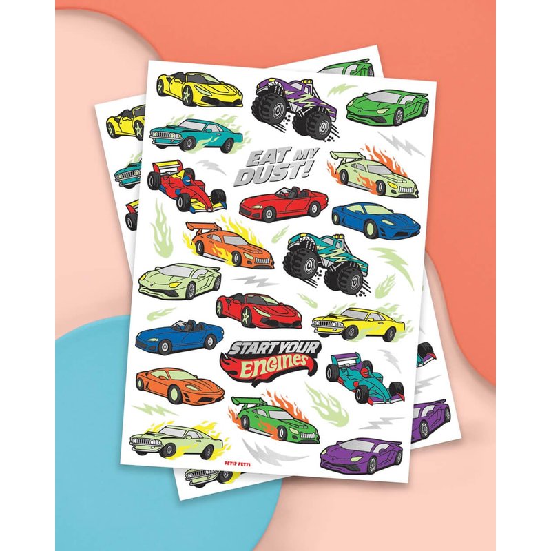 Eat my dust! Make your way into a super fun party with this colorful set of temporary tattoos! 2 sheets totaling 42 tats means there's enough for everyone - no driver gets left behind! :) Elevate your party with these tattoos that feature all sorts of cute party essentials: race cars, monster trucks, flames, + vintage cars! Party tested + approved... our tattoos will last day into night!