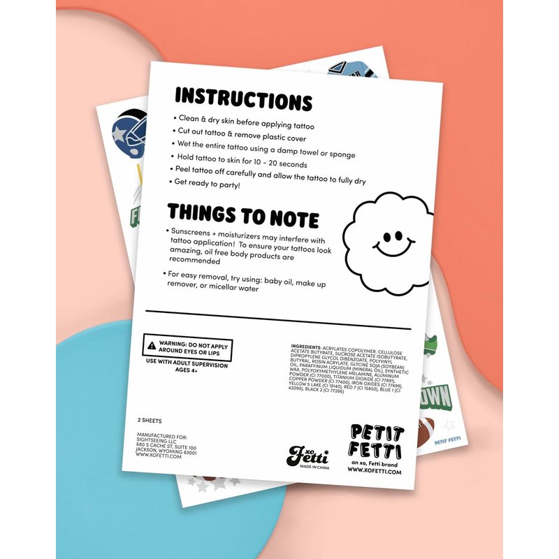 Is your team ready to go?! Tackle your way into a super cool football party with this colorful set of temporary tattoos! 2 sheets totaling 60 tats means there's one for everyone - no player gets left behind :) Elevate your party with these tattoos that feature all sorts of fun sport designs: footballs, helmets, field goals, uniforms, foam fingers, flags, megaphones, equipment, touchdowns + more! Party tested + approved... our tattoos will last day into night - so huddle up and get ready for the game of your life!