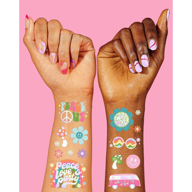 These temporary tattoos are a groovy party must have. Not only are they super cute, but guests will love them too! With 52 tattoos in total, every party girl and boy will get their own. With designs like mushrooms, smiley faces, rainbows, flowers, peace signs, sunglasses + more there is sure to be a favorite for everyone. Ready to apply? Use our easy to follow instructions on the back of the tattoo sheet. Once applied, get ready to party day into night since these are long lasting, durable, and waterproof. So, are you ready to throw the coolest retro party of all time? We got you girl (: