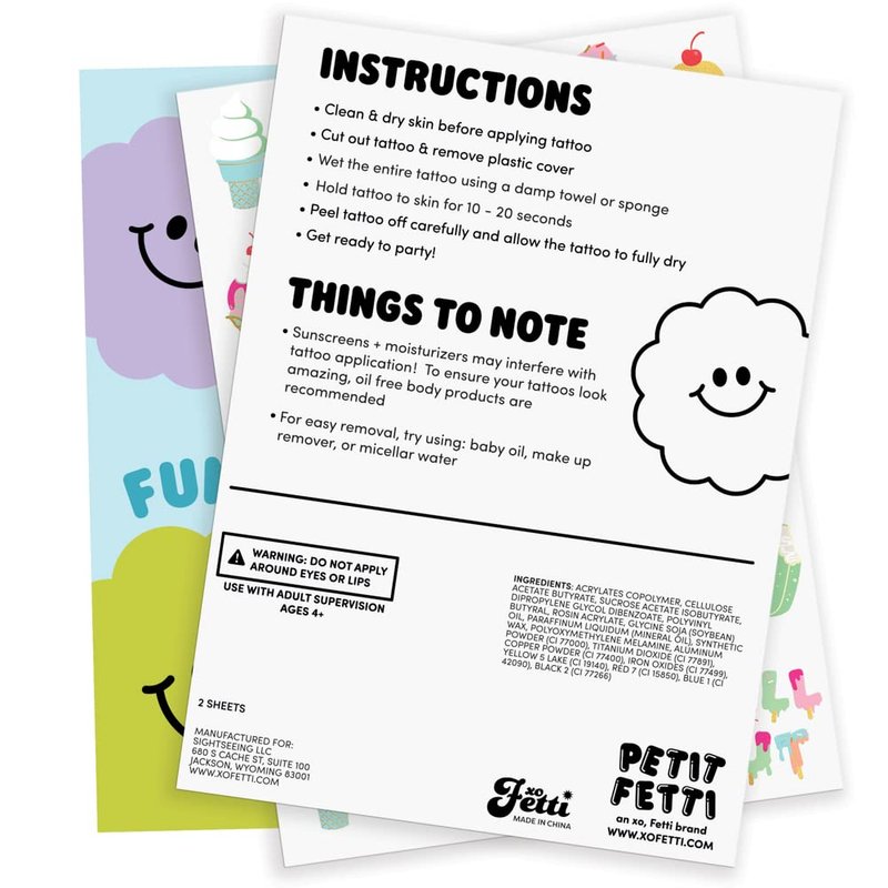- Tats for The Whole Party: two sheets with a total of 56 colored + metallic tattoos featuring handdrawn designs of ice cream sundaes, Ice pops, confetti + more that kids will absolutely love!