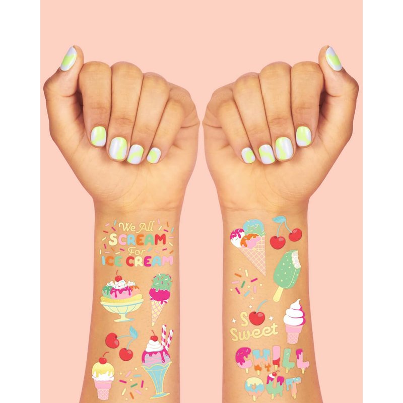 Who can say no to an ice cream cone?! Make your way into a super fun party with this colorful set of temporary tattoos! 2 sheets totaling 56 tats means there's enough for everyone - no sweet tooth gets left behind! :) Elevate your party with these tattoos that feature all sorts of ice cream party essentials: ice cream sundaes, ice cream cones, cherries, ice pops + more! Party tested + approved... our tattoos will last day into night! Yum!