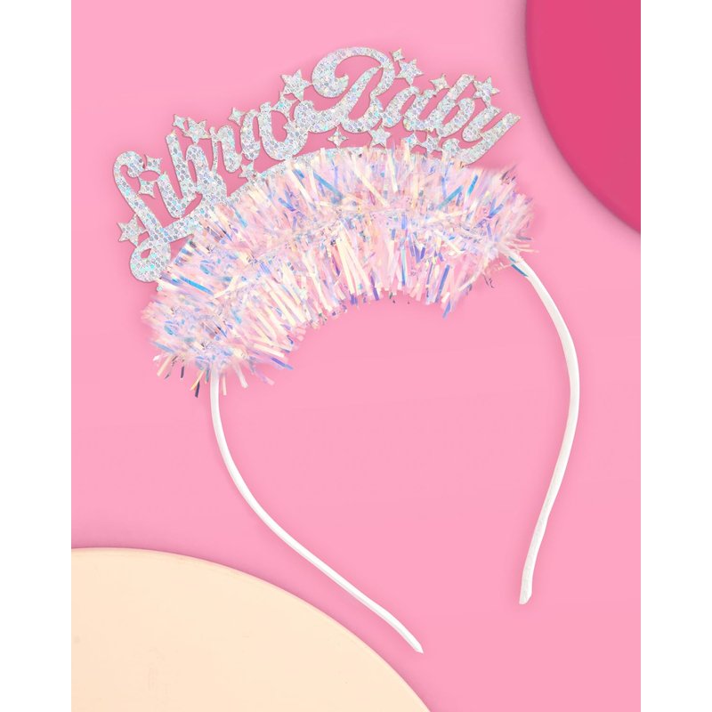 Say hello to your new fav headband! Our headband features a "Libra Baby" logo made out of the prettiest glitter fabric + iridescent fringe, and will fit anyone who wears it - which means you're going to be looking bomb for your party! Get ready to shine bright like a diamond while celebrating your birthday! Our headbands are made to fit any adult and child! This headband is truly the ultimate party accessory!