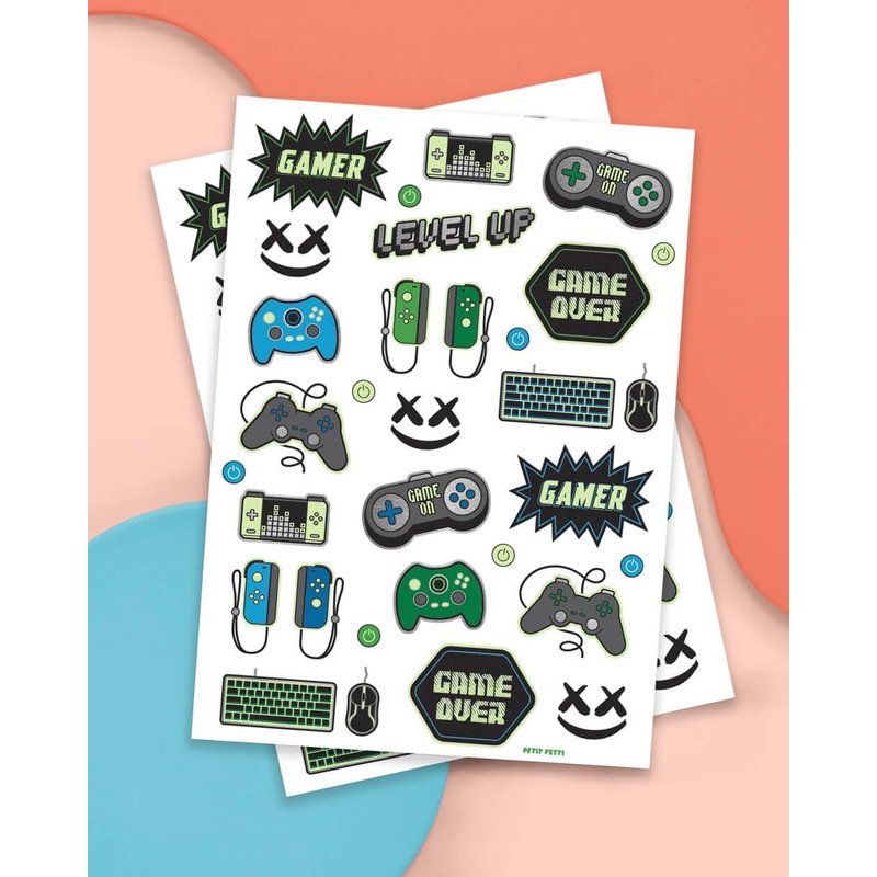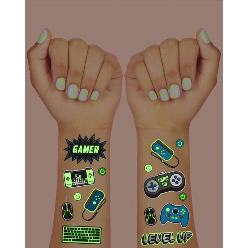 - Gamer Tattoos For The Whole Party: two sheets with a total of 40 colored + glow in the dark tattoos featuring handdrawn designs of keyboards, controllers, game over, level up + more that kids will love!