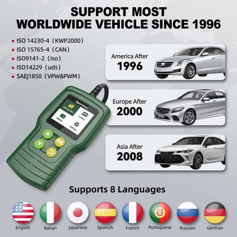 - UNIVERSAL COMPATIBILITY & PROTOCOL SUPPORT - The XpertAuto C302 automotive scanner is compatible with a wide variety of vehicles, including OBDII/EOBD compliant cars, trucks, SUVs, minivans, and hybrids sold worldwide. It supports multiple protocols, including J1859-41.6, J1850-10.4, ISO9141, KWP2000 (ISO14230), and CAN (Control Area Network ISO11898). The user-friendly interface offers multilingual menu options