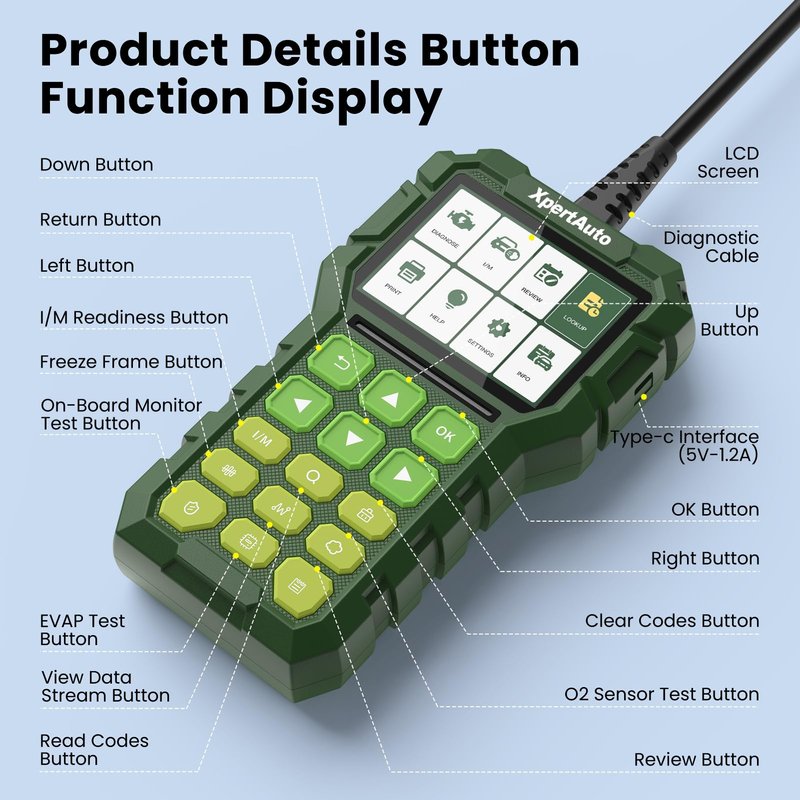 10 Modes of OBD2 Functions,Keep Cars Running Safely on the Road. Read Codes: Read fault code existing in the current ECU. (Application: Generally, the car instrument has a fault light on, and the current fault code can be read.) Clear Codes: Delete the fault code in the current ECU. (Application: Carry out this function after the car trouble is removed, the trouble light goes out. If the current fault cannot be cleared, perform this function after maintenance is required.) Live Data: Read and display the real-time operating data and parameters of the car ECU. (Application: By observing these real-time data streams, maintenance technicians can gain insight into the overall performance of the vehicle and provide guidance for vehicle maintenance.) Freeze-Frame: When the vehicle has a fault, a fault code will be generated, and the freeze-frame can be used to view the data of the vehicle at the moment when the fault code is generated. (Application: The maintenance technician judges the fault location based on the relevant data.) I/M Readiness: This shows whether the various emissions-related systems on the vehicle are operating properly and are ready for inspection and maintenance testing. On-Board Monitor Test: This function can be used to read the on-board diagnostic monitoring test results of a specific component/system. EVAP Test: The EVAP test function allows you to initiate a leak test of the vehicle's EVAP system. This tool does not perform a leak test, but sends a signal to the vehicle's on-board computer to initiate the test. The vehicle manufacturer determines the standards and methods for stopping the test after the test has started. Before using the system test function, please refer to the vehicle's maintenance manual to determine the process required to stop the test. Vehicle Information: Read the version information of the current car ECU DTC Lookup: DTC Detailed Description. Input the 5-digit code--View its detailed definition--View the diagnostic tips/solution for the current DTCs