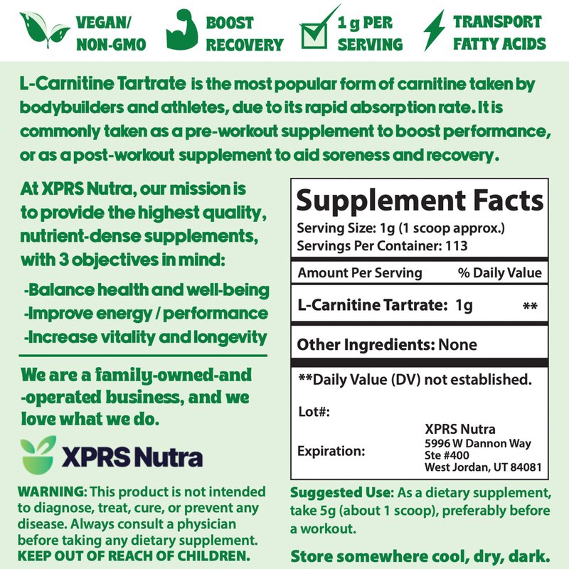 - Love Your Supplements: You'll love the superior quality of our L Carnitine powder pure. Here at XPRS Nutra, our first priority is ensuring that we are providing our customers with premium supplements in an ethical manner and at an affordable price. Try using our empty capsules to fill your LCarnitine plus Tartrate bulk supplements powder.