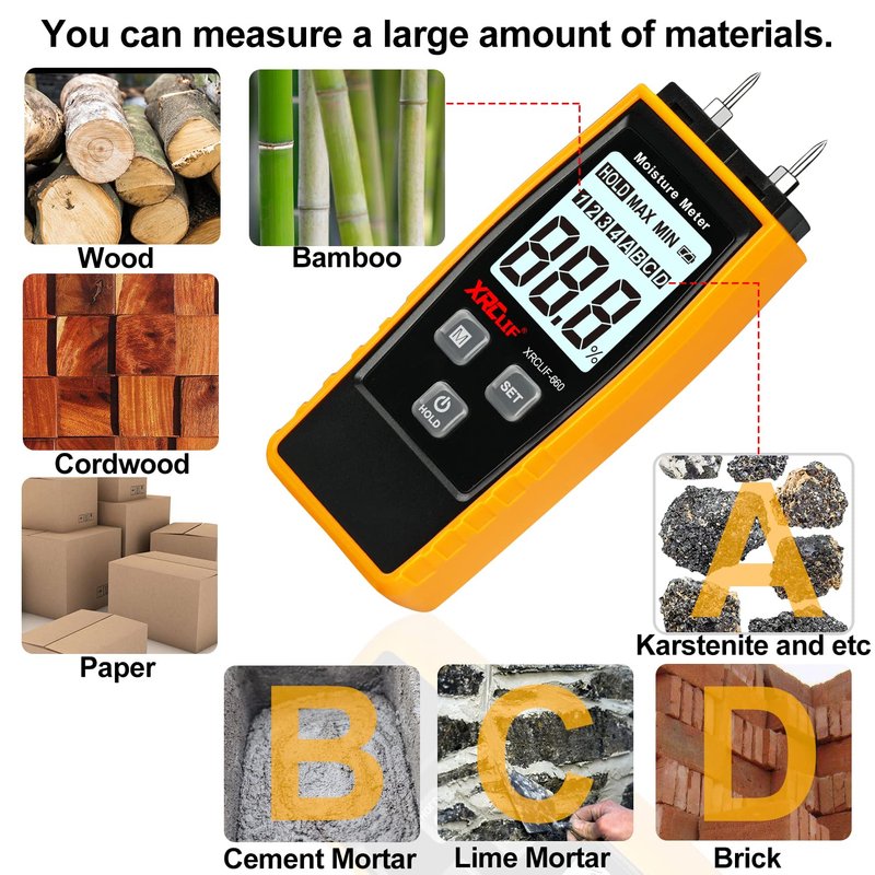 - 【8 Type Selection】: This wood moisture meter can be applied to measure different wood(0-55%), as well as other material like cement mortar(0%-8.6%), lime mortar(0%-9.9%), bricks(0%-16.5%) and karstenite (0-11.0%).