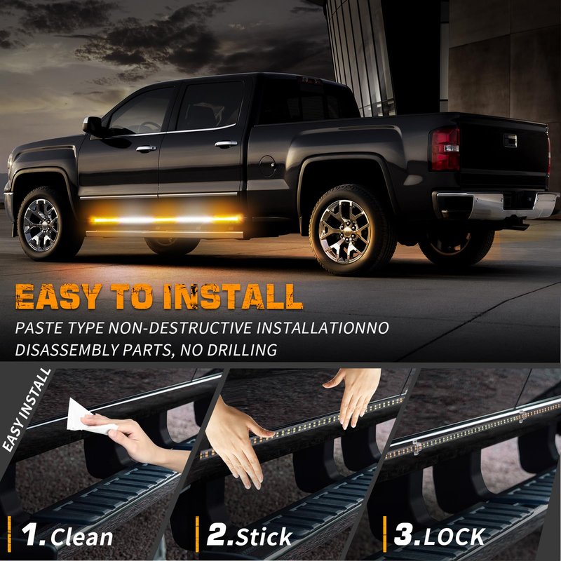 - 【EASY TO INSTALL】Just clean the mounted surface, peel and stick the side step lights for installation. Strong adhesive and clear locks ensure stable installation. Even driving through lots of rain, highway speeds, potholes, the safety light can still stay on and work great.