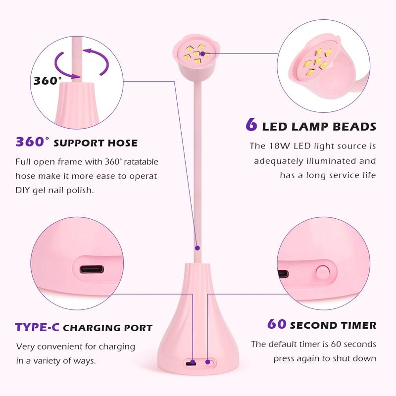 - 💞360° Rotation Cordless Nail Dryer -- This 18W powerful portable led nail lamp is 360° rotatable, thanks to this first ever upgraded function, it can be flexibly adjusted the height and direction of the light to ideal position as you want. It's extremely convenient to carry it around to enjoy your DIY nails. Our cordless uv led nail lamp is USB rechargeable and up to 6 hours lasting time, no matter in the salon or at home, you can enjoy the manicure time with your families and friends.
