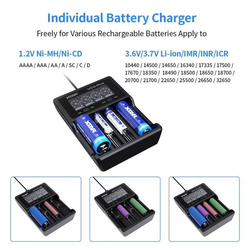 - XTAR VC4 PLUS features a USB C port and is compatible with 3.6/3.7V Li-ion and 1.2V Ni-MH batteries.
