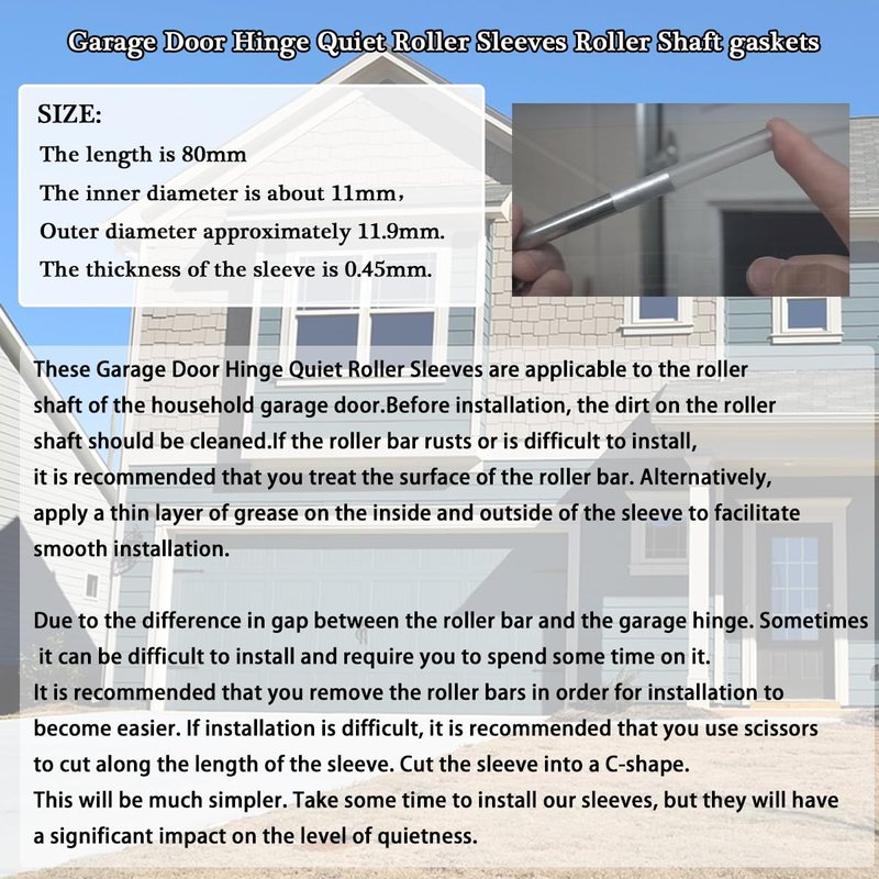 - √【Reduce Noise】:These Garage Door Hinge Quiet Roller Sleeves are applicable to the roller shaft of the household garage door. Before installation, the dirt on the roller shaft should be cleaned.If the roller bar rusts or is difficult to install, it is recommended that you treat the surface of the roller bar. Alternatively, apply a thin layer of grease on the inside and outside of the sleeve to facilitate smooth installation. After installation, it fits the roller shaft very well, which not only extends the service life of the roller shaft of the Garage door, but also reduces the noise of the Garage door operation.