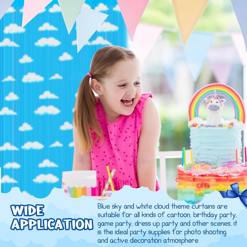 - Ideal Party Supplies: blue sky and white cloud theme curtains are suitable for all kinds of cartoon, birthday party, game party, dress up party and other scenes, it is the ideal party supplies for photo shooting and active decoration atmosphere, suitable for doorway, windows, walls, bedrooms, game rooms and stage backdrop decoration