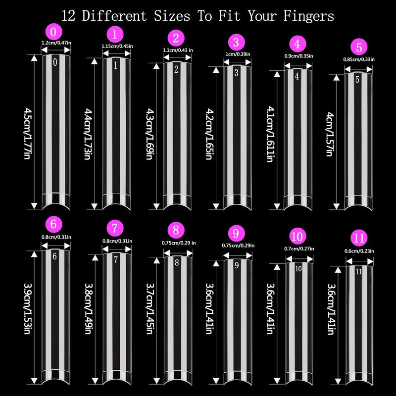 - 12 SIZES XXL Acrylic Nail Tips: Our 600 pcs clear nail tips no c curve has 12 different sizes to suit for most finger. Each nail tip has the pre-numbered, numbered 0-11 individually for you to distinguish easily and find your desired nails quickly. And 2 extra size can fit bigger or smaller nails, in case 10size can not suit several of your nails.