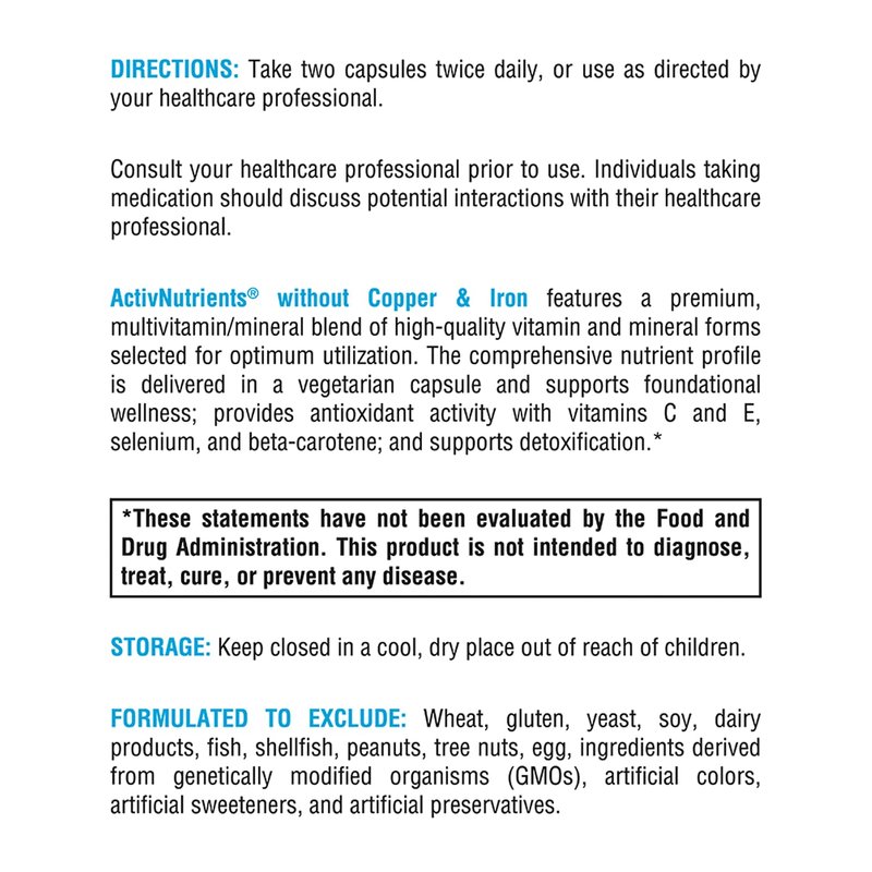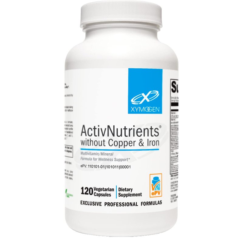 Premium men and womens multi vitamin. ActivNutrients without Copper & Iron features a premium, multivitamin/mineral blend of high-quality wellness vitamins and mineral forms selected for optimum utilization including zinc vitamin c vitamin d nutrients. The comprehensive multi vitamin with minerals nutrient profile is delivered in a vegetarian capsule and supports foundational wellness; provides antioxidant nutritional supplements with vitamins C and a vitamin e supplement, selenium, and vitamin beta carotene from Vitamin A; and supports detoxification.* XYMOGEN multi vitamins supplements for adults are practitioner trusted. Women and men multivitamin support for a variety of protocols.