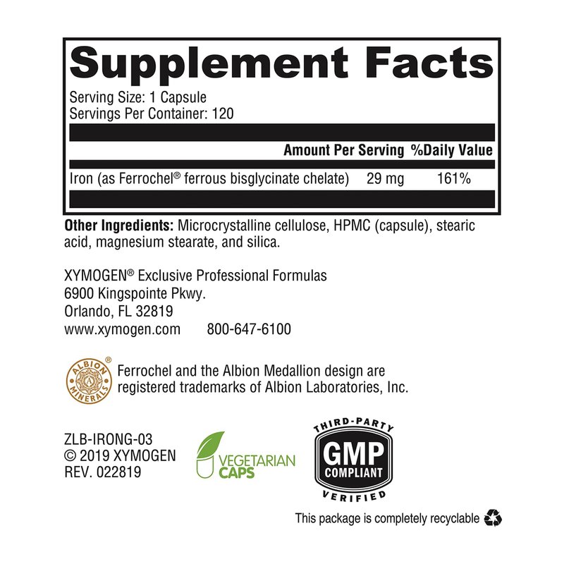 XYMOGEN Iron Glycinate - Gentle, Highly Absorbable Iron Supplement for Women + Men - 29mg Patented Iron Bisglycinate Chelate Supports Healthy Ferritin and Hemoglobin Levels (120 Iron Capsules)