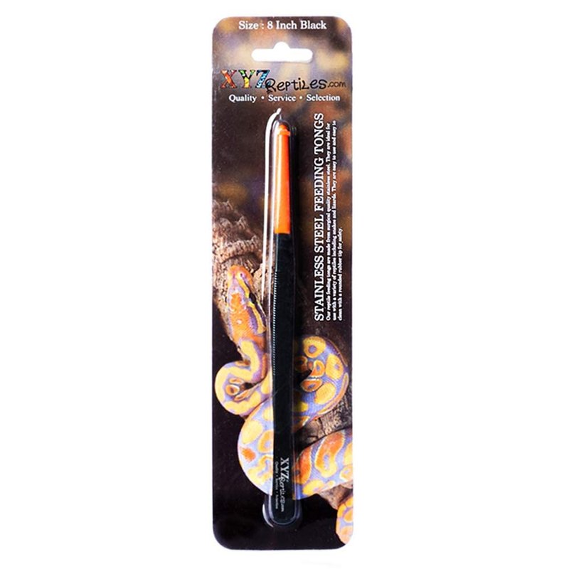 Our snake feeding tongs are made from surgical grade quality stainless steel. They feature grooved sides for a non slip grip and PVC food grade tips for your animal's safety during feeding. We offer our snake tongs in two colors as well as two sizes. Both 8 inch and 12 inch sizes are available to meet your specific reptile feeding needs. You can choose black with an orange tip or orange with a black tip as per your color preference. Our feeding tongs also feature the xyzReptiles mantra, are easy to use and easy to clean. Our snake feeding tongs are ideal for a variety of snakes and other reptiles including lizards.