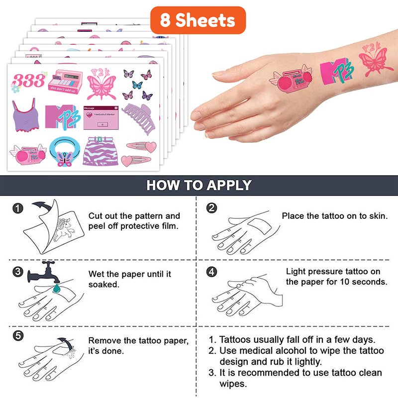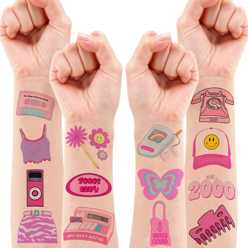 🩰【PERFECT TATTOOS FOR THEMED Y2K DECORATIONS】: 2000s temporary tattoos pertaining to our particular collection will accommodate children’s expectations that they always anticipate to have them at Birthday party, Christmas, and special celebrations. Each tattoos set covers 8 sheets in total with 96 Pcs. The size of each tattoo sticker is 6.1*3.1 inches, one size fit for kids. The numerous formed 2000s tattoos designed to desirable color promising to create the living atmosphere for parties. 🎁【GREAT GIFT IDEAS FOR Y2K PARTY SUPPLIES AND DECORATIONS】: Are you looking for an item for the 2000s theme? This is a gift not to be missed. With cute shimmering images of Pink Y2K that will make you return to the style of the 2000s. Wow!!!! 🌍【SAFE AND ENVIRONMENTALLY CONSCIOUS】: Our temporary tattoos are made from materials that are safe and prioritize sustainability. These tattoos are created using paper that is both safe for users and friendly to the environment. 🥳【ADD A TOUCH OF FUN】: Are you tired of mundane gifts? We've got you covered! Our collection of adorable and vibrant temporary tattoo designs can be applied to laptops, backpacks, desks, suitcases, books, water cups, and more. These playful elements will surely elevate your visual experience and bring a touch of joy to everyday items. 🌸 A few notes about our Y2K tattoos: 8 sheets + 96 tattoos means there's one for everyone - nobody gets left behind :D .Each of our temporary tattoos has a unique design with Y2K, 2000s, 2000, 00s, cell phone, cap, high heel shoe, brim hat, hairpin, key, cd, microphone, alarm clock, butterfly, music player, camera, mp3, pen, cow girl hat,...gifts ideas for kids girls …. Can be used for the y2k birthday party, bridal shower + Christmas, Halloween, y2k school supplies, baby shower! 【 Not recommended for people with a history of sensitive skin, if symptoms appear, stop using immediately】.