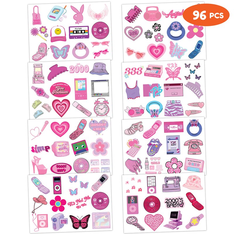 Y2K 2000 Temporary Tattoos for Teen Girls | 96PCS Birthday Party Decorations Supplies Party Favors 00s Pink Cute Gifts Classroom School Prizes Themed Christmas Tattoos Sticker