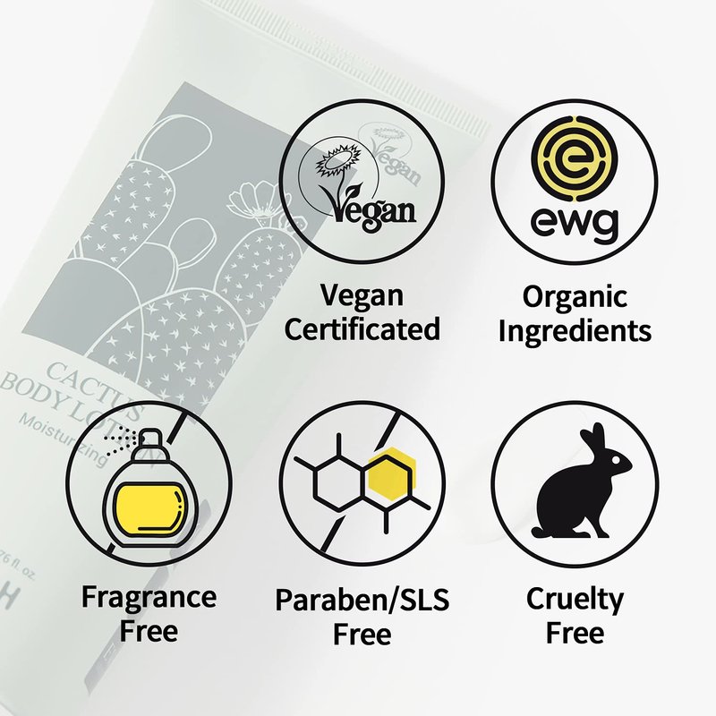 - CACTUS EXTRACT: EWG Green graded ingredients with over 69% of prickly pear extract in our Cactus Body Lotion. Cactus holds 5 times more vitamin C and vitamin A than that of Aloe Vera. It also contains 'Tocopherol' which provides moisture to exhausted skin and also acts as daily protection to your skin.
