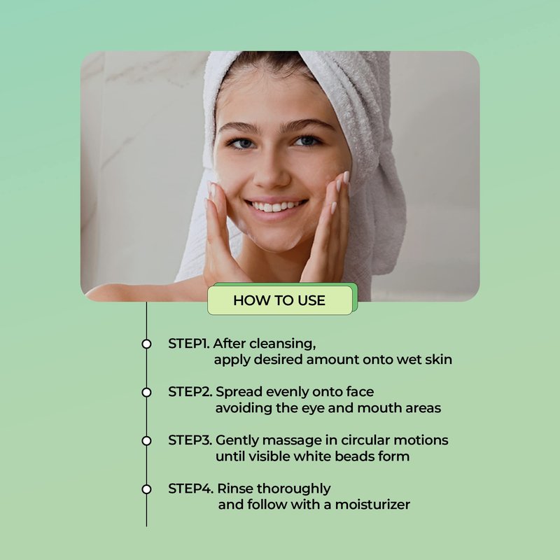 - HOW TO USE: After cleansing, apply a desired amount onto clean skin. Spread evenly onto face avoiding the eye and mouth areas. Gently massage in circular motions until visible white beads form. Rinse thoroughly and follow up with a moisturizer.