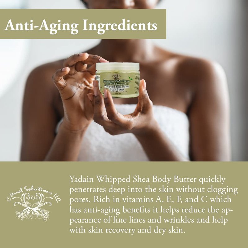 - POWERFUL NATURAL ANTI-AGING INGREDIENTS: This Yadain Whipped Shea Body Butter feels fantastic on the skin, it quickly penetrates deep into the skin without clogging pores and delivers its nutritional payload very effectively. Rich in vitamins A, E, F, and C which has anti-aging benefits that help reduce the appearance of fine lines and wrinkles and help with skin recovery and dry skin.