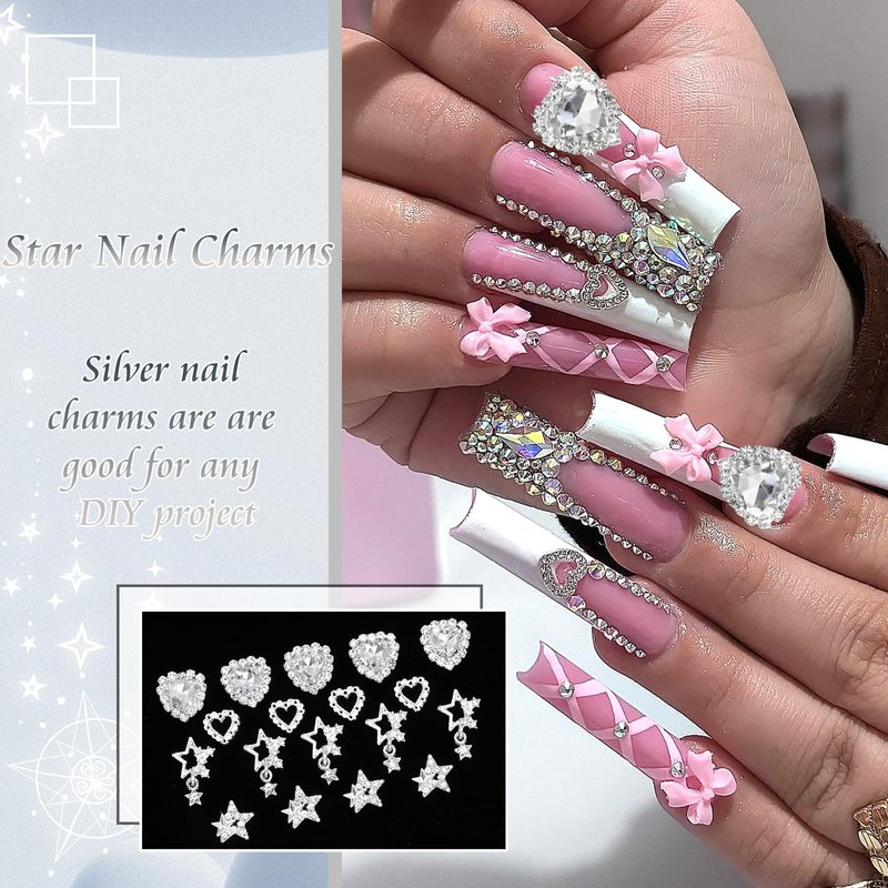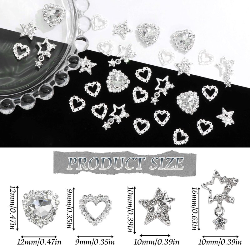 Package Includes: About 10pcs star charms for nails,20pcs diamond heart charms for nails
