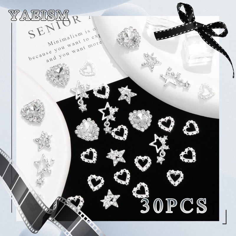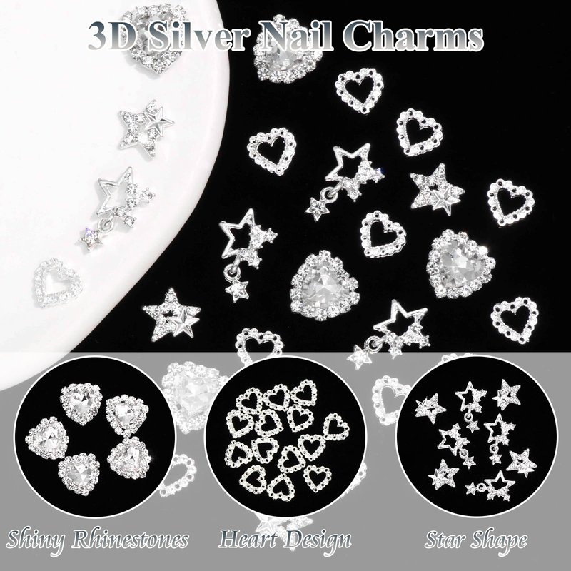 YAEISM 30PCS Star Nail Charms 3D Crystal Heart Nail Charms Alloy Silver Nail Charms Shiny Starlight Nail Gems and Charms Jewelry Rhinestones for Women Nail Art and DIY Crafts Decoration