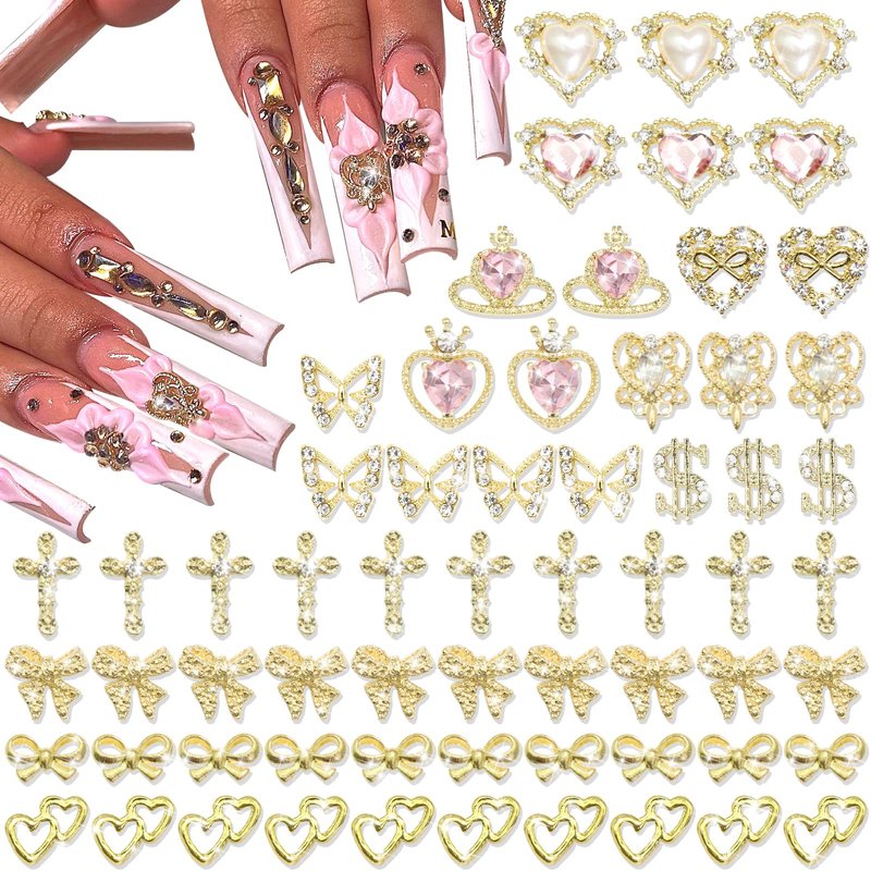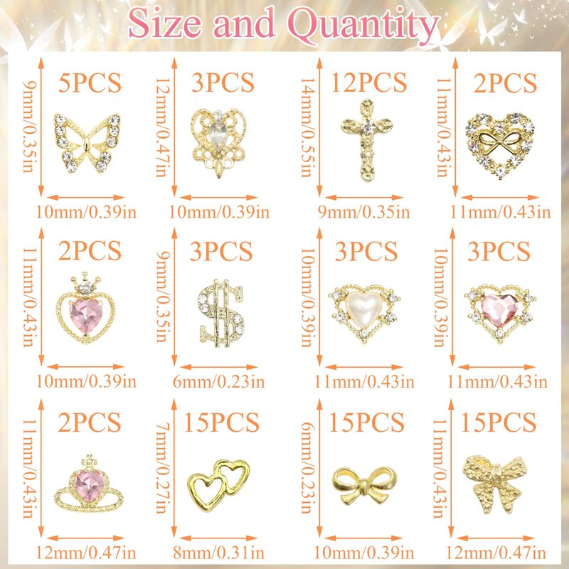 Package Includes: About 12pcs nail crosses,3pcs money nail charms,5pcs butterfly charms,2pcs gold bows nails,28pcs heart nail charms,30pcs chrome nail bows