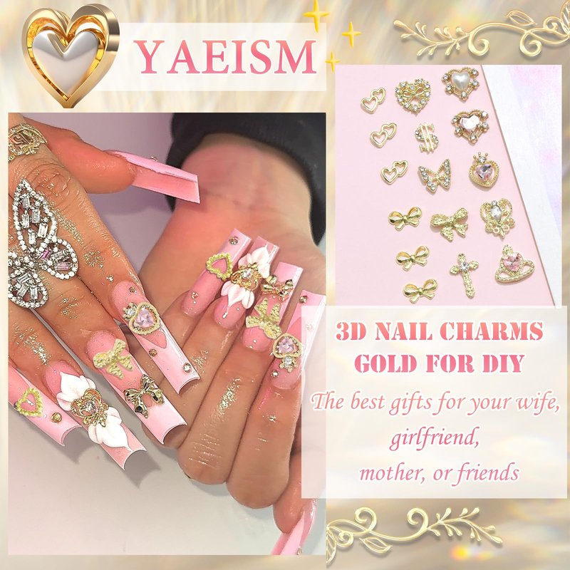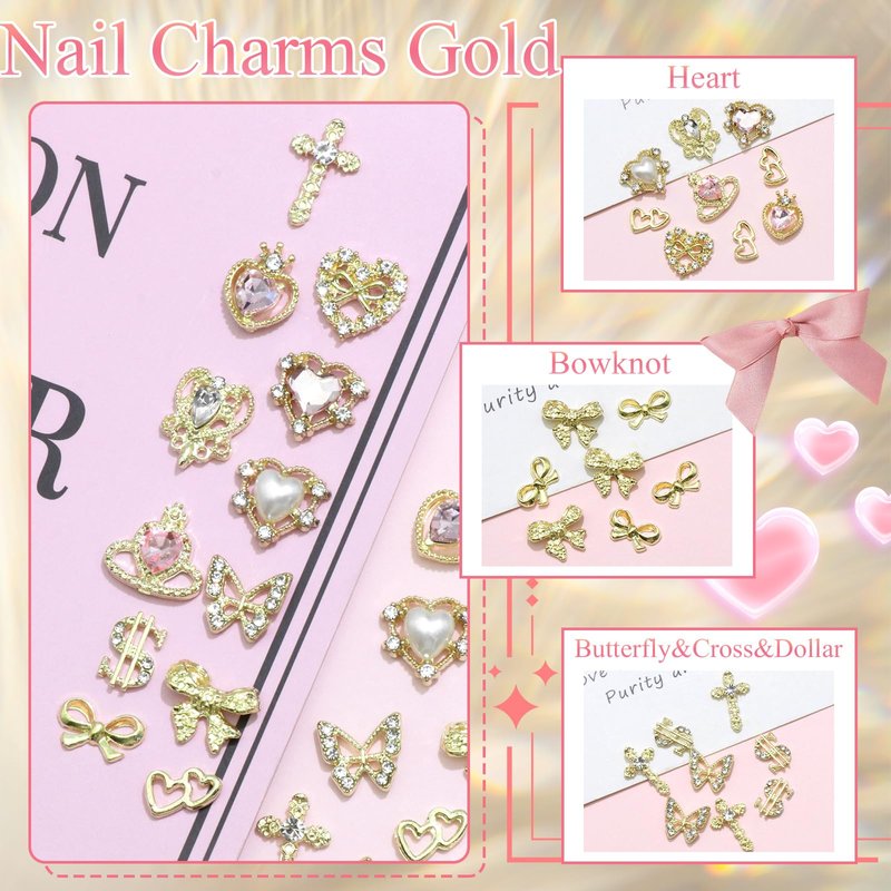 - Fashion Forward - Gold charms for nails stay ahead of the trends with charms that create to the latest in fashion and nail art design. Cross and heart butterfly elements let you create unique personalized nail art