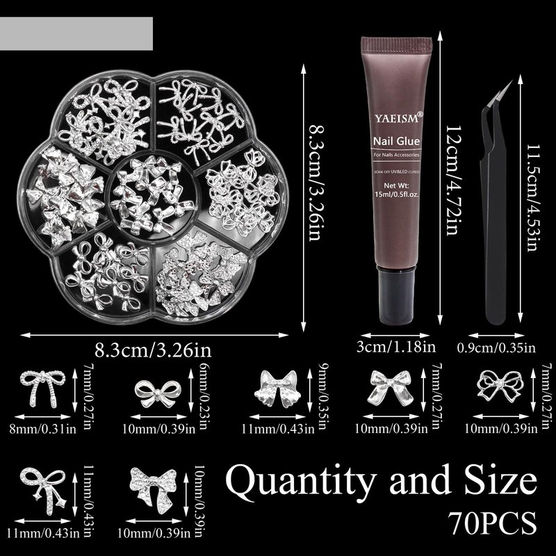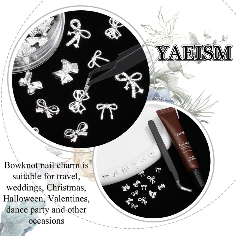 YAEISM Bow Nail Charms Silver Metal Bowknot Charms 70PCS Bow Nail Art Charms Kits with Glue Gel, Tweezer for Nail Art and DIY Crafts Decoration