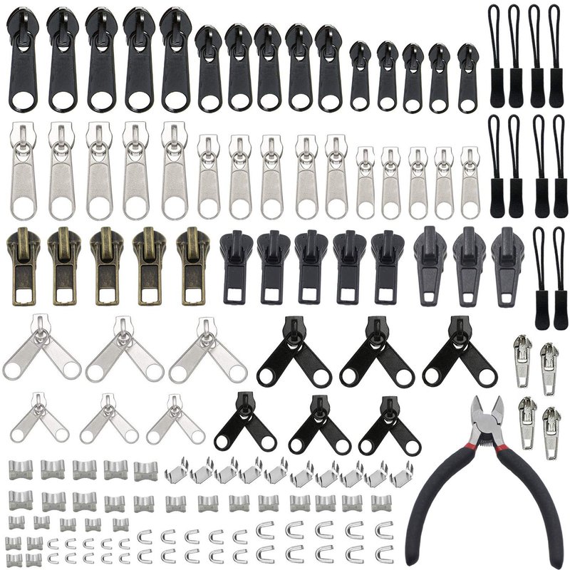 - ✅ QUANTITY AND SIZE: 52pcs sliders for nylon coil zippers(3#, 5#, 8#), 5pcs sliders with locking for metal zippers(5#), 5pcs sliders with locking for molded plastic zippers(5#), 10pcs black pulls, 70pcs stops (3#, 5#, 8#), 1 x install plier and 1 x Instruction