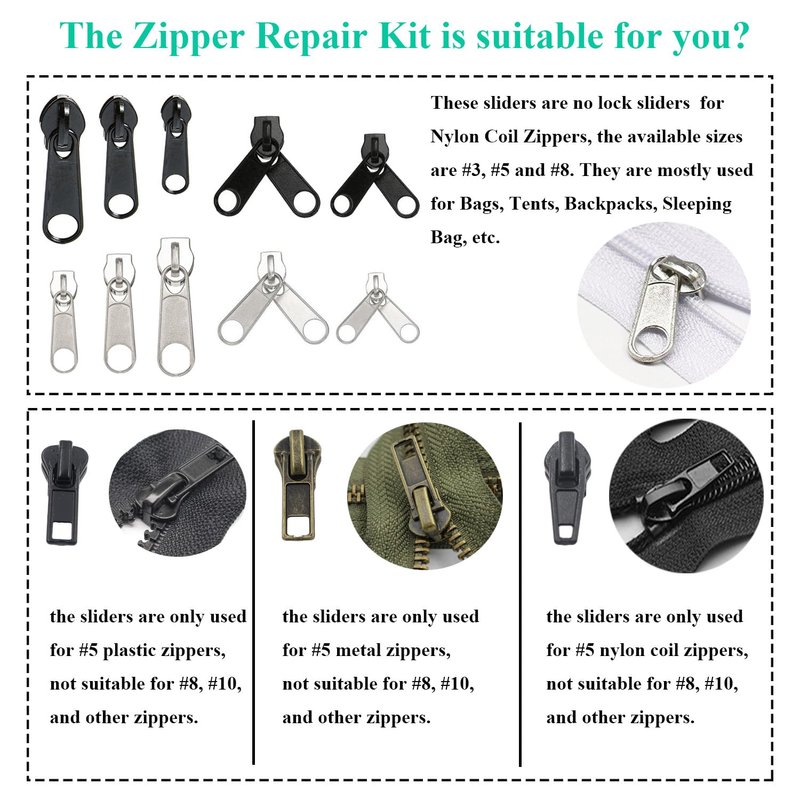 - ✅ NOTICE: Please confirm your zipper size and type before purchase. If you don't know how to repair zipper or pulls, please don't buy the kit.