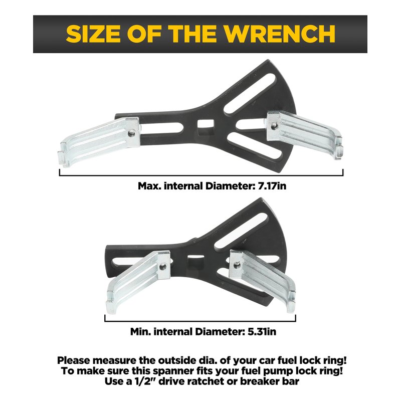 - [Adjustable Size] This fuel tank locking ring tool has 3 easily adjustable arms, with an adjustable range of 5.83 to 7.83 inches, suitable for different oil pump locking rings. Please confirm the size before purchasing.