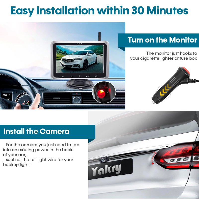 - 【DIY Installation in 30 Mins】 Worried about wires running from your monitor to your camera? The wireless backup camera saves you money on installation ①Just hook up the 1080P monitor to your cigarette lighter or fuse box ②Find the taillight wire for back up camera for cars and connect the power.