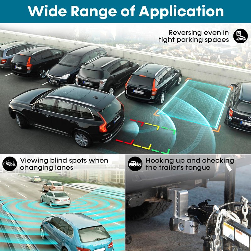 - 【Coverage for More Blindspots】Will you still hesitate when reversing and changing lanes? Back up camera systems for truck can be added in front/rear/side of the vehicle, also can be used as a trailer hitch camera to easily see if the hitch is on the ball.