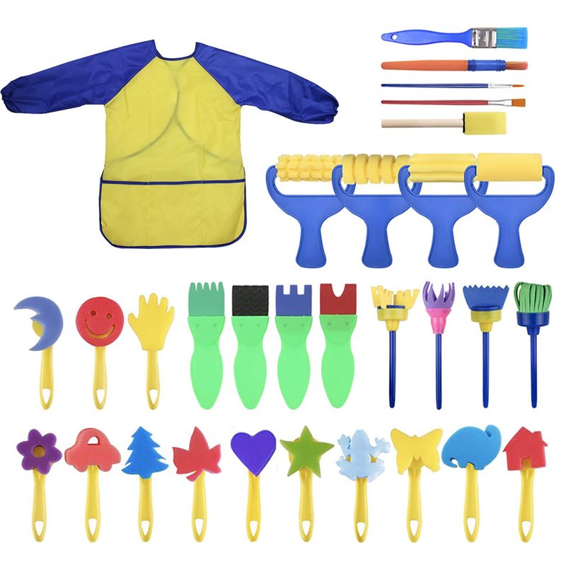 - 31 pieces include--1 x Long Sleeve Waterproof Apron,4 x Stamp flower painting brushes,4 x Roller sponge brushes ,4 x sponge roller brushes,13 x ponge brush,2 x Paint Brush,2 x Fine brush,1 x Sponge shovel