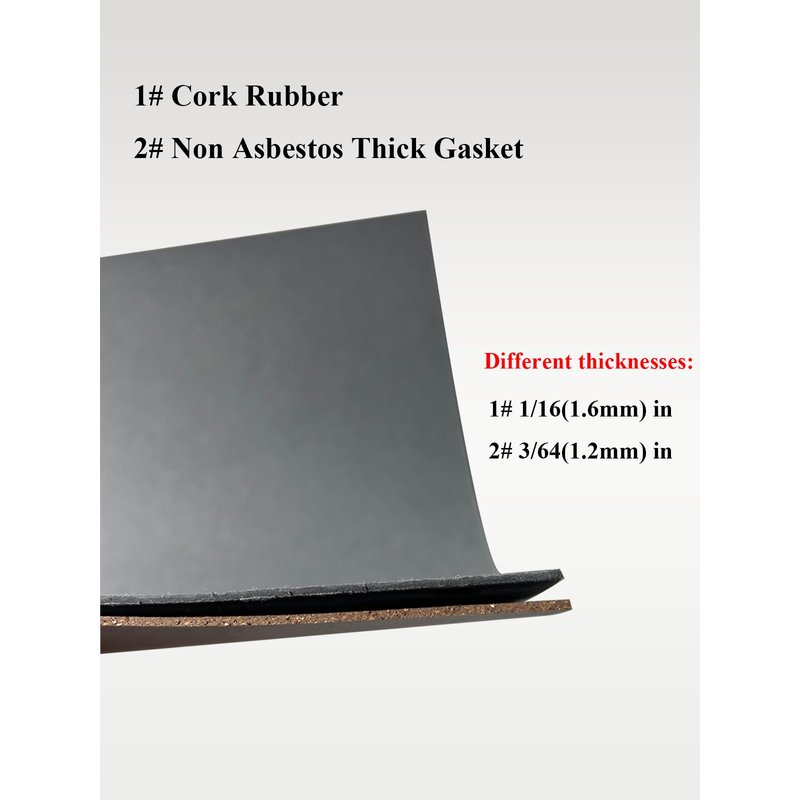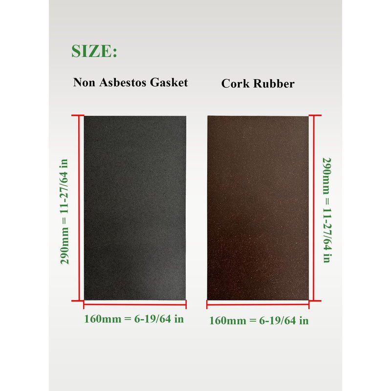 - 2 types thick gasket material: Non Asbestos Gasket 1.2X160X290mm and Cork Rubber 1.6X160X290mm, are perfect for gasket sealing in the thickness range with its flat, flexible and dense nature, generally suitable for oils, gas, diesel fuels and solvents, especially good for tiny or thin gasket need because it's easy to cut and fit.