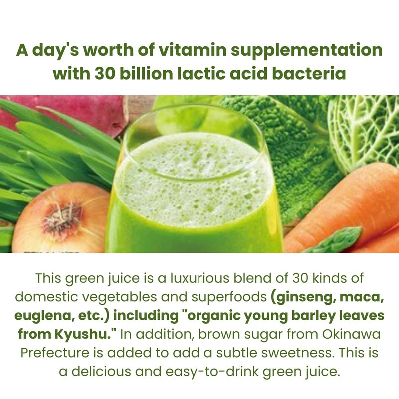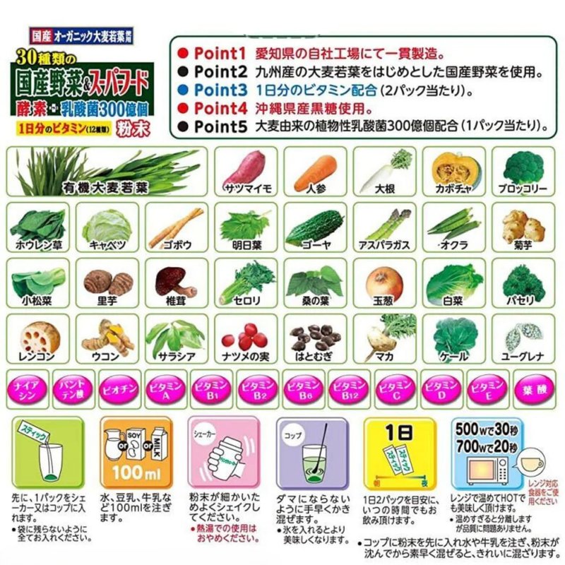 Yamamoto Kanpoh Superfood Green Powder Drink, Organic Barley Young Leaves & 30 Types Vegetables & 12 Vitamin Blends for Daily Nutrition from Japan, 32 Sachets Ingredients: Organic barley young leaves (domestic), brown sugar, vegetable powder (sweet potato (red Haruka), carrots, radish (dice) + radish leaves, pumpkin, broccoli, spinach, cabbage, gobo, tomorrow's leaves, bitter gourd, asparagus, okura , Chrysanthemum, Komatsuna, Satoimo, Shiitake mushroom, Celoli, Mulberry leaf, Onion, White vegetable, Parsley, Renkon), Rice koji, Lactose (including milk component), Lactic acid bacteria (sterilized), Ukon, Saracia, Natsume nut, Hatomugi, Maca, Koryo Ginseng, Euglena, Vitamin C, Vitamin E, Niacin, Pantothenic Acid, Sweetener (Somatin), Vitamin B1, Vitamin B2, Vitamin B6, Vitamin A, Folic Acid, Vitamin D, Vitamin B12 Per energy: 20 kcal, protein: 1.6 g, fat: 0.3 g (n-3 vitamins: 0.13 g), carbohydrates: 3.4 g (sugar: 2.1 g, dietary fiber: 1.3 g), salt Equivalent amount: 0.009 g, zinc: 0.2 mg, calcium: 32 mg, iron: 0.5 mg, copper: 0.04 mg, magnesium: 8 mg, manganese: 0.08 mg, phosphorus: 16 mg, niacin: 13 mg, pantothenic acid: 4.8 mg, biotin: 50 μg, vitamin A: 770 μg, vitamin B1: 2.3 mg, vitamin B2: 1.4 mg, vitamin B6: 1.3 mg, vitamin B12: 2.4 μg, vitamin C: 100 mg, vitamin D: 5 .5 μg, Vitamin E: 6.3 mg, Vitamin K: 136 μg, Folic acid: 240 μg Lactobacillus YK-1: 60 billion * n-3 fatty acid (omega 3)