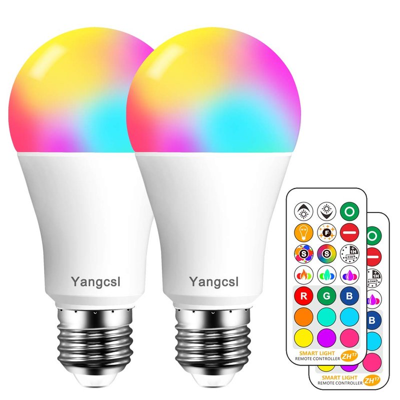 Yangcsl LED Light Bulb 85W Equivalent, RGB Color Changing Light Bulb, 6 Moods - Memory - Sync - Dimmable, A19 E26 Screw Base, Timing Remote Control Included (Pack of 2)