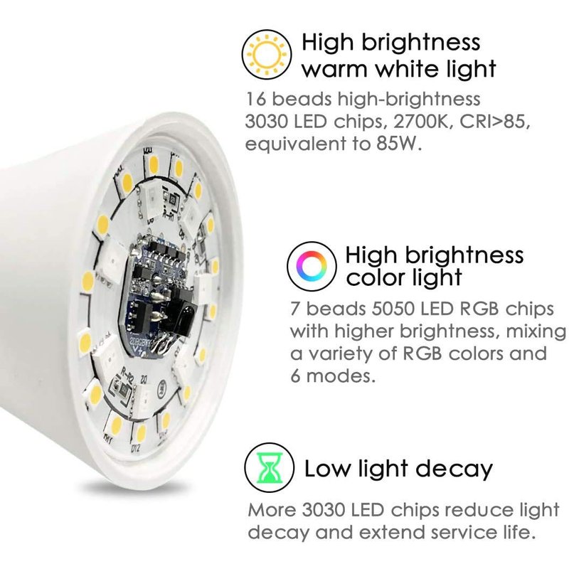 - This is a LED color changing light bulb with remote control. It is very easy to operate and adjust brightness, It fits multi-purpose in life. It has warm white for daily illumination, 2700K, CRI>85, equivalent to 85W; There are 9 RGB color and 6 modes for mood and decoration as well. In addition, it comes with 2-year-warranty, 90-day-refund guarantee ensuring high quality standards applied and friendly customer service provided.