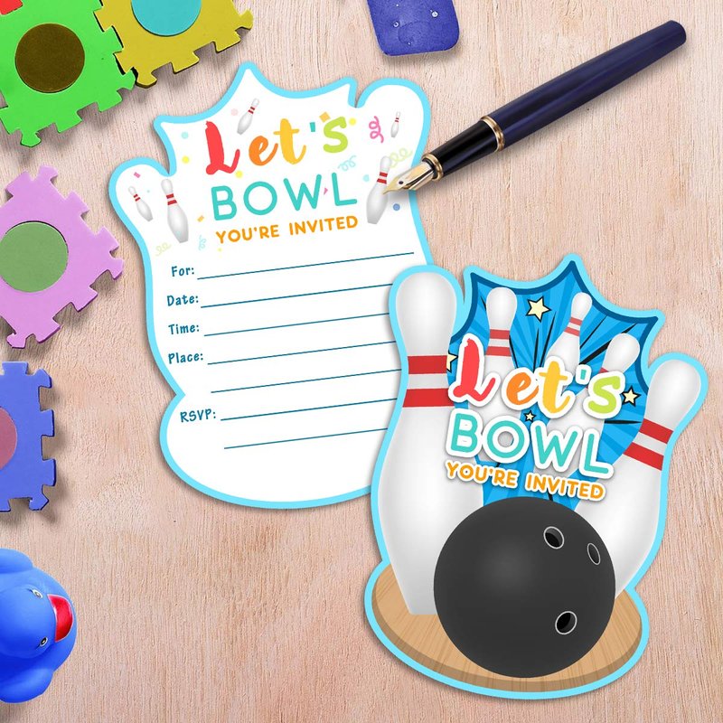- 30 bowling birthday invitations and 30 envelopes.