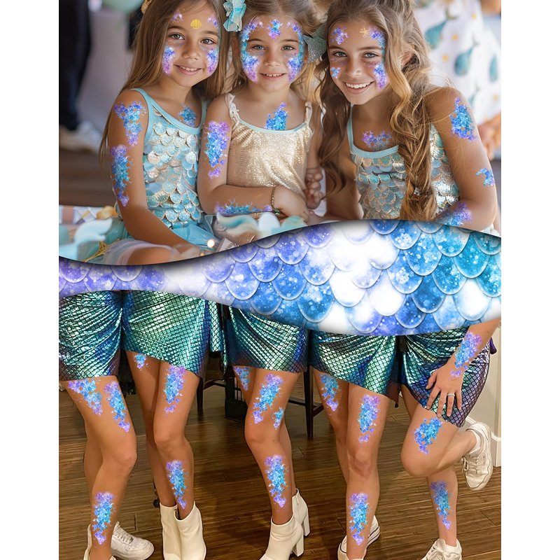 - Girls Temporary Tattoos: Our mermaid scale tattoos are temporary, so they're ideal for kids who love to change their style. Use them as mermaid birthday party supplies or mermaid gifts for girls who adore the magical undersea world.