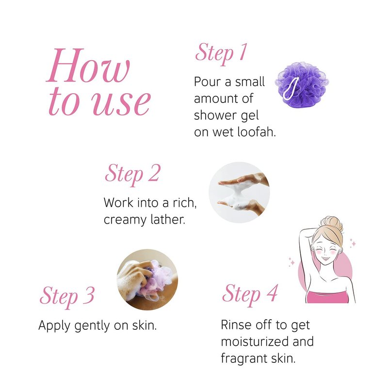 - Directions: Pour a small amount of shower gel on a wet loofah. Work into a rich, creamy lather. Apply gently on skin. Rinse off for cleansed and fragrant skin.
