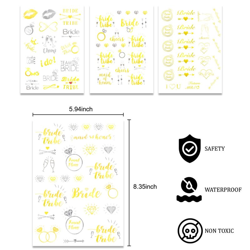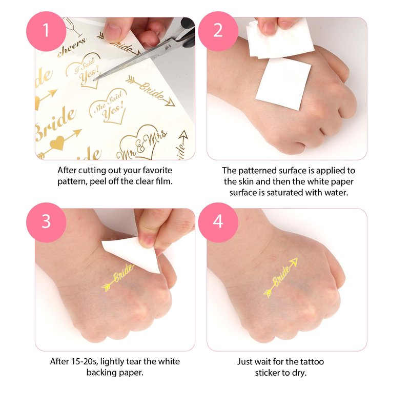 - Easy to Use: Our bachelorette tattoos are easy to apply and remove, child safe, waterproof and sweat resistant. Simply apply your favorite style to your skin and moisten with water. Press and hold for about 15 seconds, then remove and you will see a shiny tattoo effect that gives you instant charm.